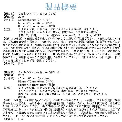 【使用上の注意】・お肌に合わない時は、ご使用をおやめください。・使用中、または使用後に異常があらわれた場合は、使用を中止し皮膚科専門医等にご相談ください。そのまま使用を続けると症状を悪化させることがあります。・香りが弱くなる場合がありますがご使用には問題ございません。・保管環境によりフィルム表面に白い粉(界面活性剤)が生じることがありますがご使用には問題ございません。・乳幼児の手の届かないところに保管してください。・高温多湿、光を避けて保管してください。・目に入らないように注意し、目に入った時にはすぐに水で洗い流してください。