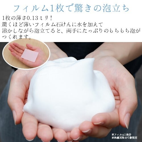 薄いフィルムに水を加えるとすぐに溶け、両手にたっぷりのもちもち泡がつくれます。溶け残りにくく使用感は抜群!