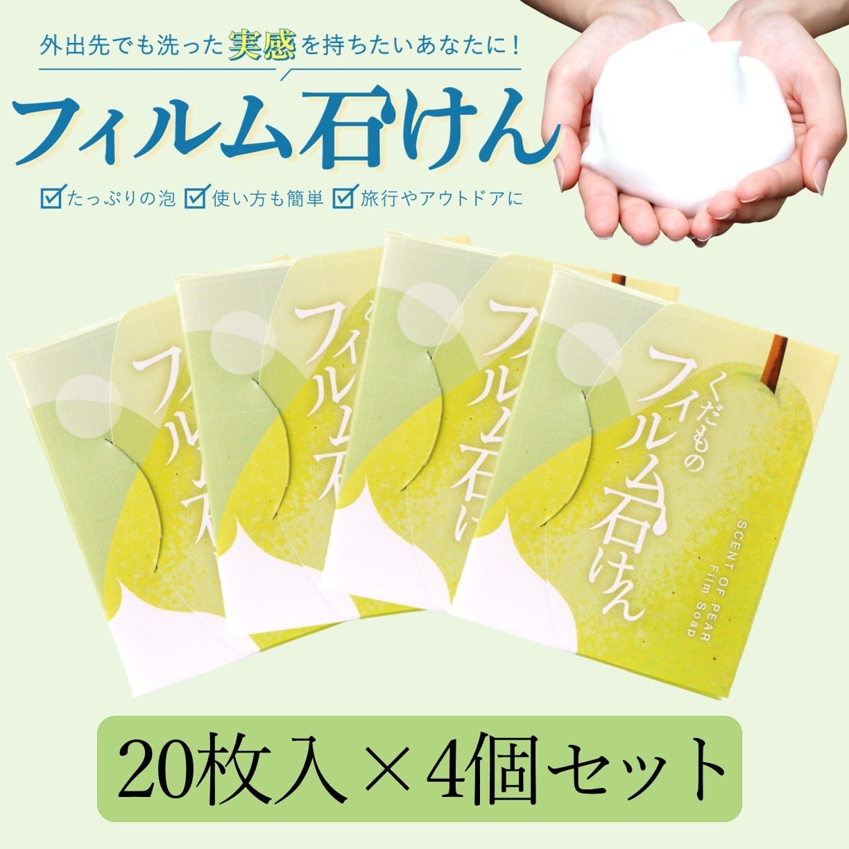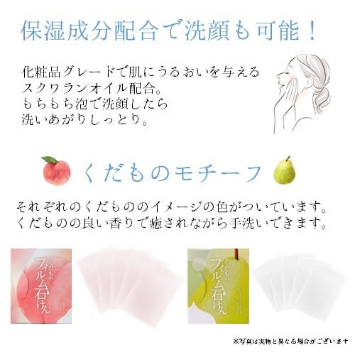 フィルム石けんとは、泡立てた石けんをそのまま薄いフィルム状にしたものです。もこもこ泡で作られたこの石けんは、洗うたびに心地よい柔らかな泡が手を包み込み、汚れをきれいに落としてくれます。フルーツの美味しさをイメージしながら、この石けんで手を洗ってリフレッシュしてみませんか?